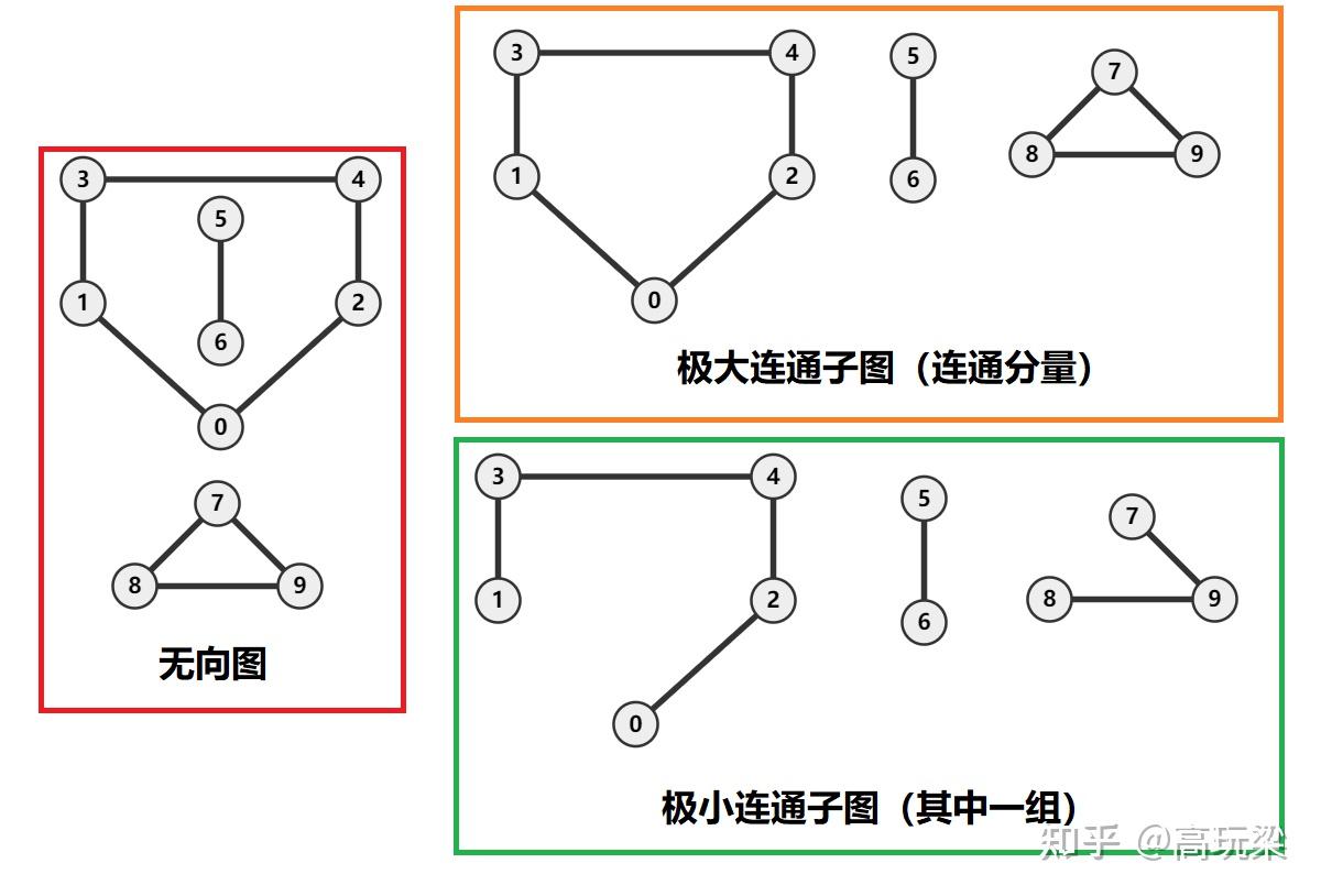 3. 连通分量:(无向子图)在分量中的任何两个顶点都可以经由该图上的边抵达另一个顶点,且没有任何一边可以连到其他子图的顶点